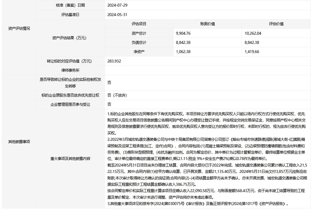 煙臺城宏軌道交通裝備科技有限公司20%股權(quán)